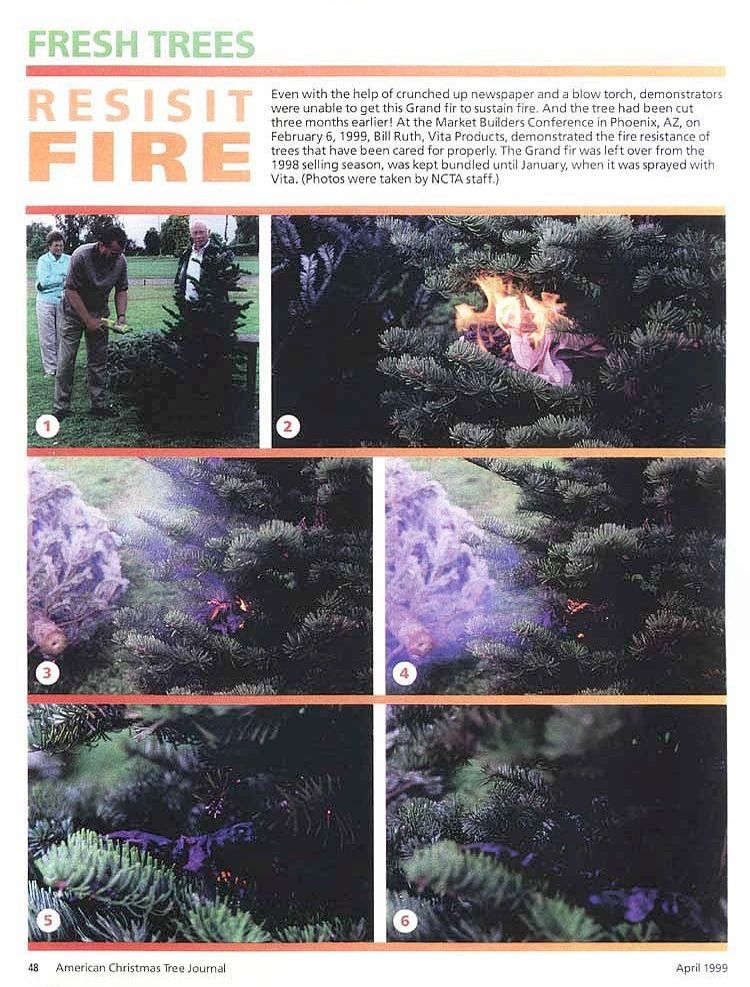 February 5, 1999 a demonstration for the National Christmas Tree Association was shown by Vita Products, Inc. to demonstrate that the trees were still fresh and moist and that a moist tree will not support combustion. A propane torch was set to the needles of a randomly selected Frasier Fir, Noble Fir and Scotch Pine Tree. Another demonstration was shown with a half newspaper rolled into a ball, and placed into the tree limb. The paper was then set on fire. None of the trees ignited; the moisture content of the tree actually extinguished the fire. The ultimate test was conducted on a Scotch Pine which was extremely dry. The paper ball was ignited and the small tree ignited at the top but would not burn down the tree. It eventually put itself out.